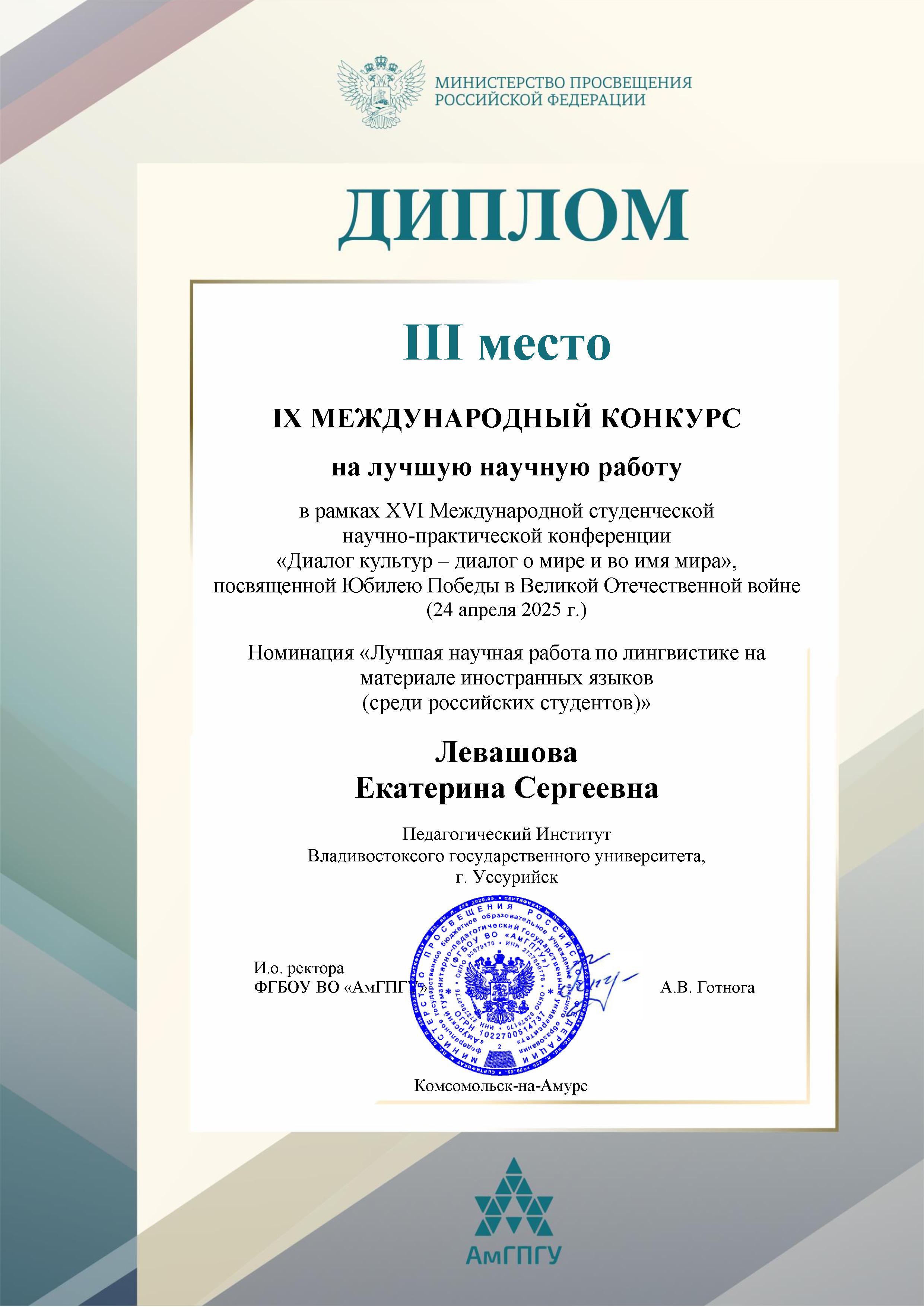 IХ Международного конкурса на лучшую научную работу в рамках ХVI Международной студенческой научно-практической конференции «Диалог культур – диалог о мире и во имя мира» | конкурс | Международный | 11.04.2025 - 07.05.2025 | 3 место |