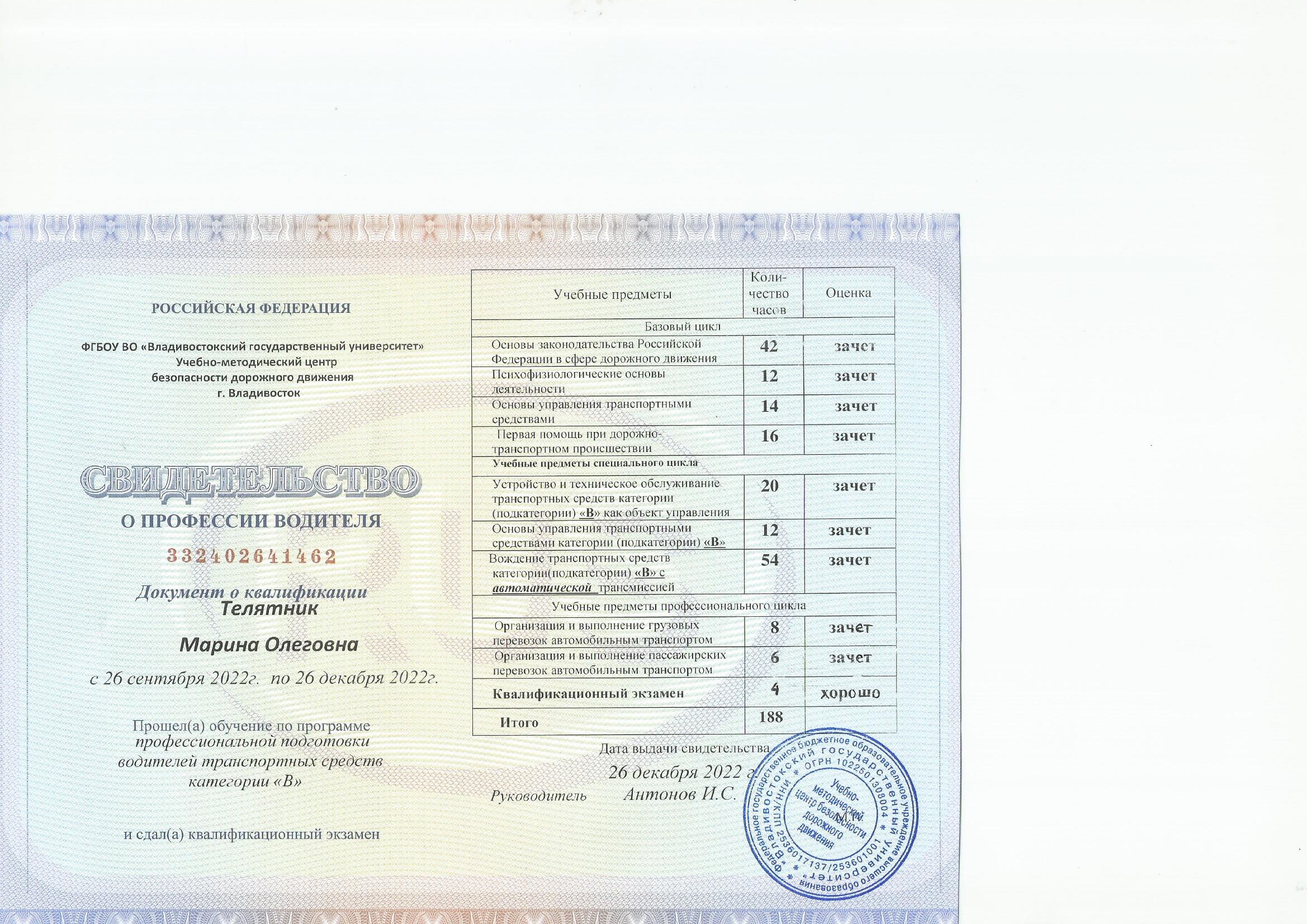 26.09.2023 - 26.12.2022 | экзамен | Прошла обучение по программе профессиональной подготовки водителей транспортных средств категории "В" | ФГБОУ ВО "ВВГУ" Учебно-методический центр безопасности дорожного движения г. Владивосток |