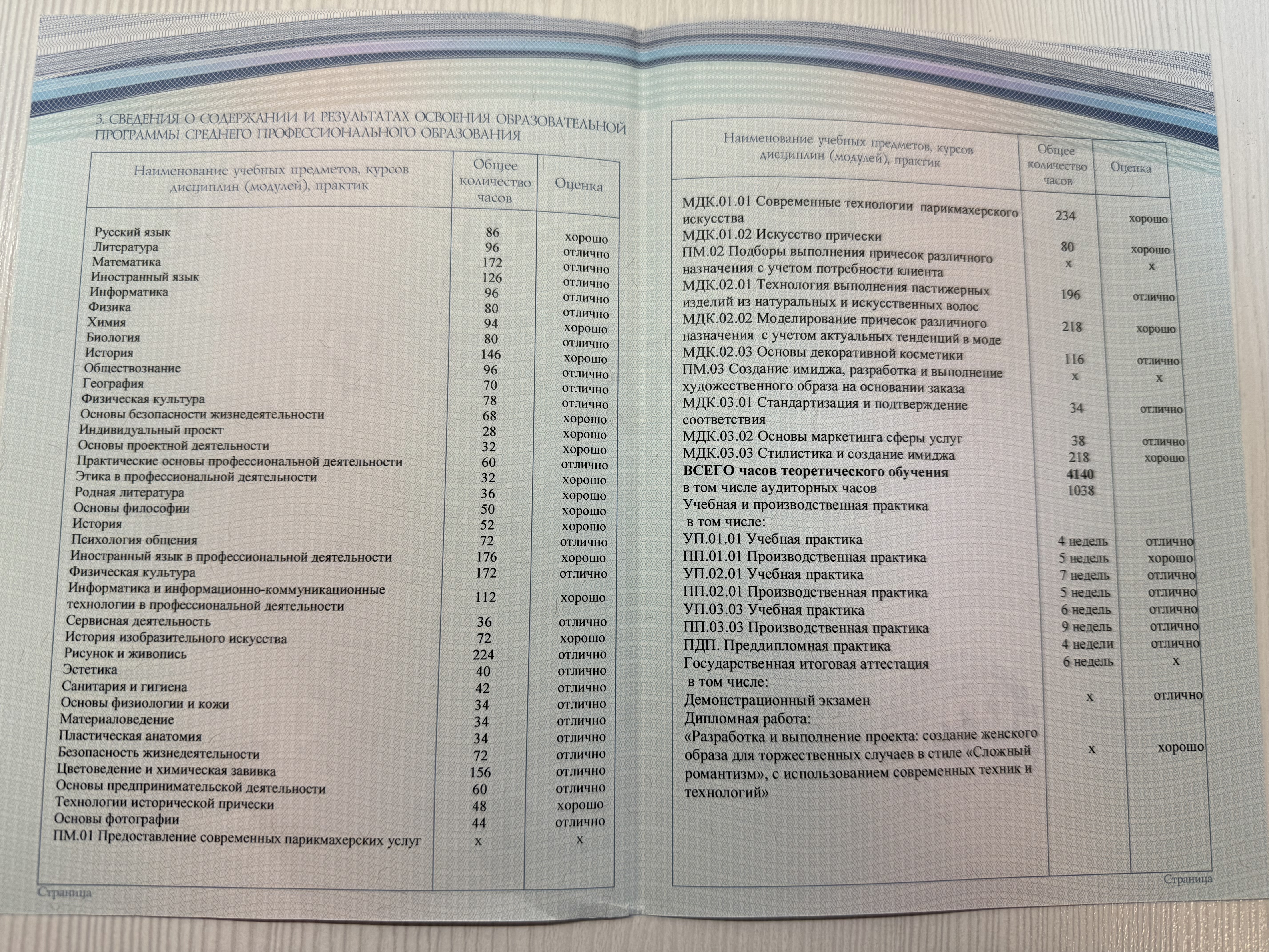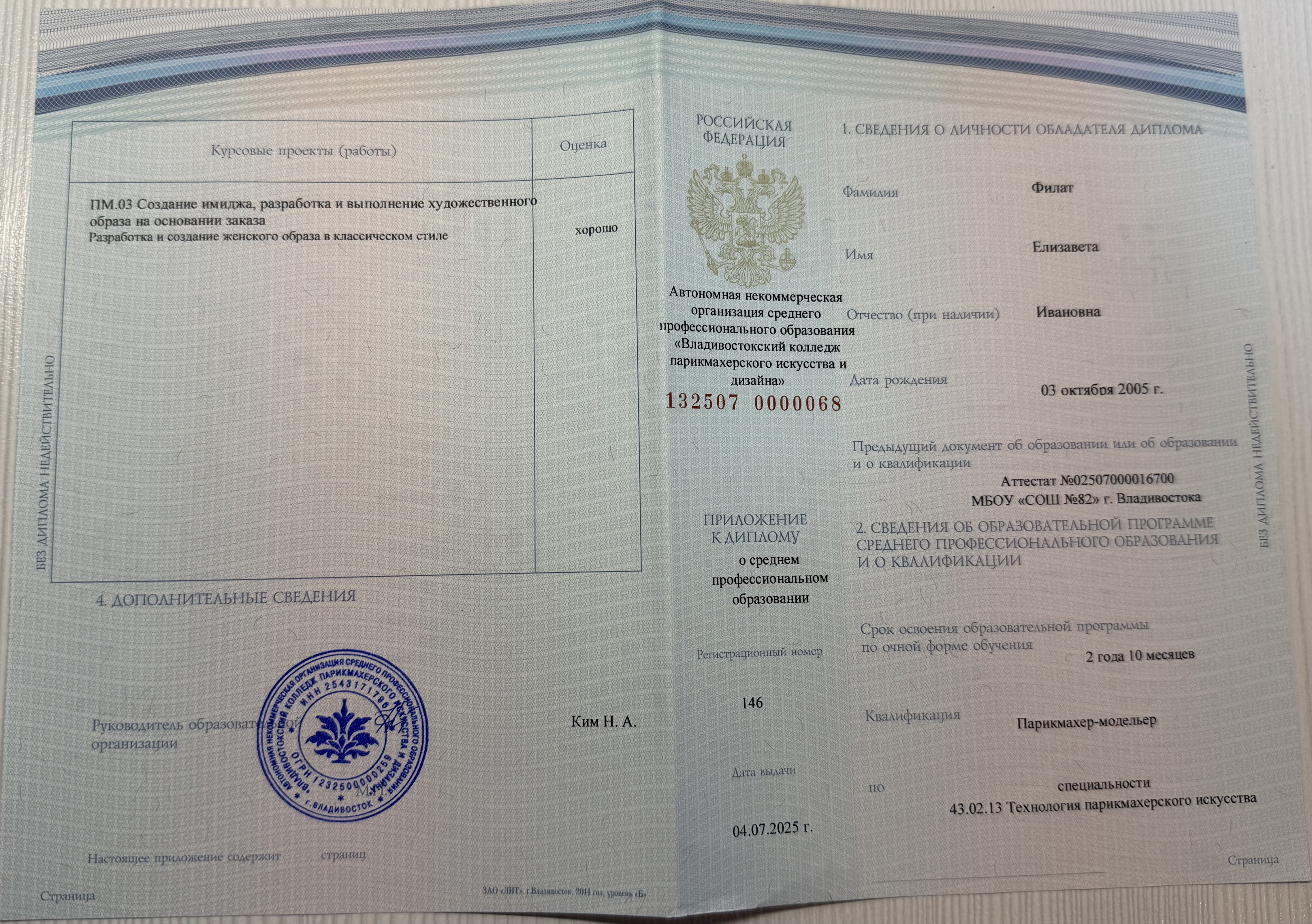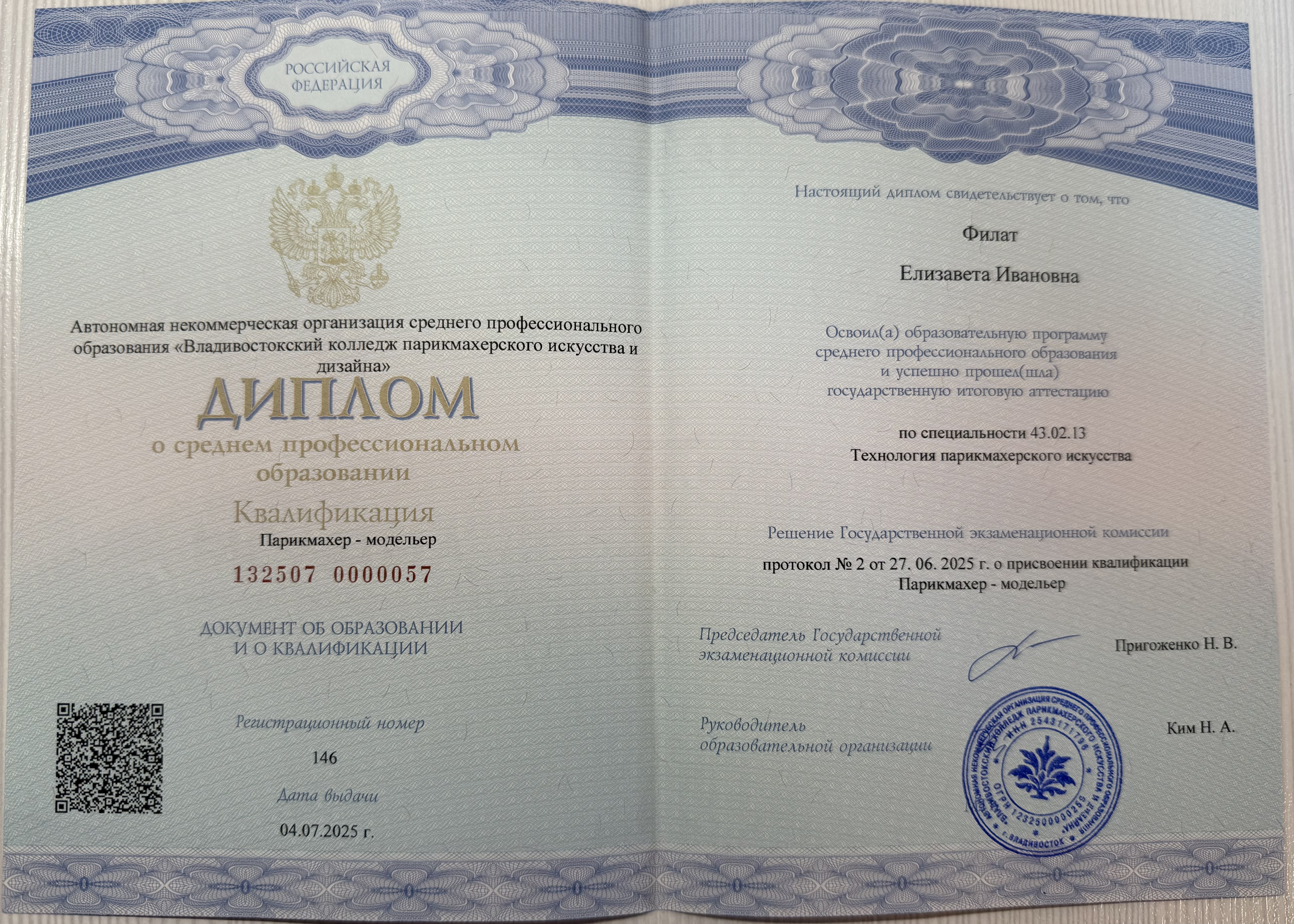 01.09.2022 - 30.06.2025 | Среднее профессиональное образование | Технология парикмахерского искусства | АНО СПО «ВКПИИД» Владивостокский колледж парикмахерского искусства и дизайна |