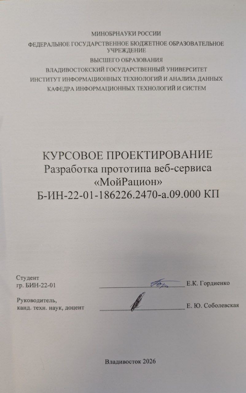 | Разработка прототипа веб-сервиса "МойРацион" |